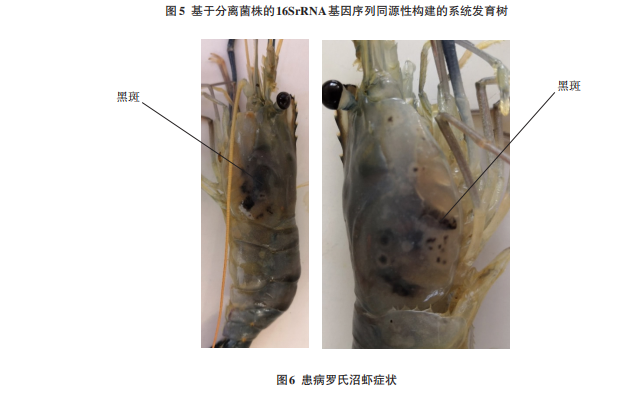 歷經(jīng)人力感柒的羅氏沼蝦發(fā)生與當(dāng)然海域生病蝦 類似的病癥,感柒羅氏沼蝦發(fā)生鰓絲腫脹,鰓絲表層出 現(xiàn)黑色斑等病癥(圖6),感柒組到7日內(nèi)所有身亡,而對 照組沒有發(fā)現(xiàn)異常。從人力感柒瀕臨死亡的羅氏沼蝦 肝肝脹機(jī)構(gòu)內(nèi)再度開展病菌分離純化,將分離出來菌種再 次開展生理學(xué)生化實(shí)驗(yàn)及其分子結(jié)構(gòu)學(xué)評定等,獲得與原分 離菌種同樣的研究結(jié)果,證實(shí)該分離出來菌種為羅氏沼蝦病原菌-豚鼠氣單胞菌(A.caviae).