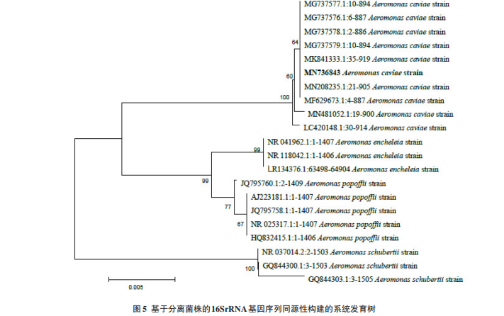 16S rRNA PCR物質(zhì)電泳原理結(jié)果(圖4)說明,從病菌 菌種的DNA模版中增加出尺寸約為1400 bp上下的片 段,合乎預(yù)期成果,系列號為MN736843,將基因序列根據(jù)NCBI開展同宗核對剖析,數(shù)據(jù)顯示與該編碼序列同 源性能比最大的菌種均是豚鼠氣單胞菌,將編碼序列與已經(jīng)知道 編碼序列搭建系統(tǒng)發(fā)育樹(圖5),能夠 看得出,該菌種與豚鼠氣單胞菌(A. caviae)聚為一個支系,融合生化實(shí)驗(yàn)和革 蘭氏上色等結(jié)果,可明確該分離出來菌種為豚鼠氣單胞菌。