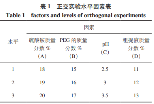 因?yàn)楦饕兀戳蛩徜@質(zhì)量濃度、PEG的質(zhì)量濃度、管理體系pH、粗提液質(zhì)量濃度)中間有互相協(xié)同效應(yīng),如表1所顯示,開展正交試驗(yàn)并剖析,圖1中硫酸銨的含量在最大值18%時(shí),可選擇性指數(shù)較大,因而正交試驗(yàn)設(shè)計(jì)方案硫酸銨濃度值再次提高,為18%、19%、20%三個(gè)水準(zhǔn)。