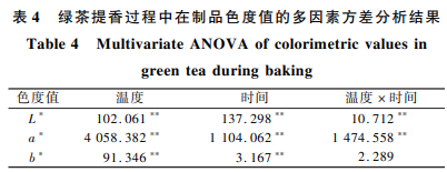 3個(gè)不一樣出香味溫度解決下,在產(chǎn)品L∗、a∗和b∗的轉(zhuǎn)變?nèi)^程見圖5。由圖5得知,在同一出香味溫度下,伴隨著時(shí)間的增加,L∗呈下降趨勢(shì),a∗呈持續(xù)上升發(fā)展趨勢(shì),b∗則在80℃中呈震蕩下降趨勢(shì),100℃中展現(xiàn)先起伏降低后起伏升高的趨勢(shì)分析,120℃中呈震蕩增長(zhǎng)的趨勢(shì)。而在不一樣出香味溫度下,總體上L∗主要表現(xiàn)為80℃>100℃>120℃,a∗和b∗主要表現(xiàn)為80℃<100℃<120℃,說明伴隨著出香味溫度的上升,在產(chǎn)品的色度減少,翠綠色顏色變?nèi)?淡黃色顏色提高。選用多要素方差分析進(jìn)一步科學(xué)研究出香味溫度、出香味時(shí)間以及配對(duì)t檢驗(yàn)對(duì)在產(chǎn)品飽和度值的危害,結(jié)果如表4所顯示。由表4得知,出香味溫度和時(shí)間對(duì)L∗、a∗及b∗均有極明顯危害。溫度與時(shí)間段的配對(duì)t檢驗(yàn)對(duì)L∗和a∗的危害達(dá)極明顯水準(zhǔn),而對(duì)b∗無(wú)明顯危害。從F值看來,出香味溫度對(duì)a∗和b∗的危害水平超過出香味時(shí)間及環(huán)境溫度和時(shí)間段的配對(duì)t檢驗(yàn),出香味時(shí)間對(duì)L∗的危害水平略大出香味溫度的危害水平。