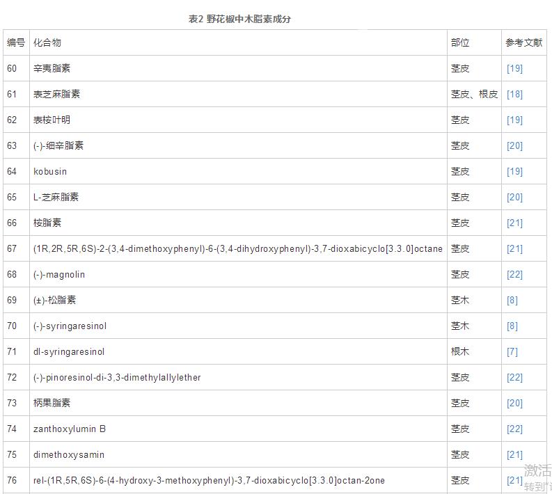 木脂素類(lèi)成份已報(bào)導(dǎo)34個(gè),其關(guān)鍵結(jié)構(gòu)特征包含四氫呋喃類(lèi)木脂素(60~79)和木脂素二聚體(80~88),別的也有苯并呋喃類(lèi)木脂素(3)和簡(jiǎn)易木質(zhì)纖維素(4)。見(jiàn)表2、圖2。