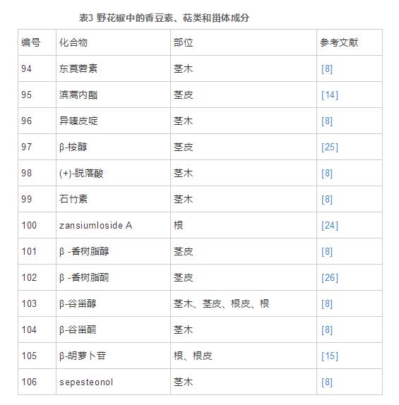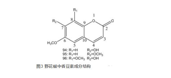香豆素類(lèi)是一類(lèi)具備苯駢-吡喃酮母核的自然物質(zhì)的統(tǒng)稱(chēng),野花椒中消息了3個(gè)香豆素類(lèi)物質(zhì)(94~96),結(jié)構(gòu)特征均為簡(jiǎn)易香豆素類(lèi),即在苯環(huán)一側(cè)有替代,且7位甲基未與6(或8)位官能團(tuán)產(chǎn)生咪唑環(huán)或吡喃環(huán)的香豆素類(lèi)。見(jiàn)表3、圖3。