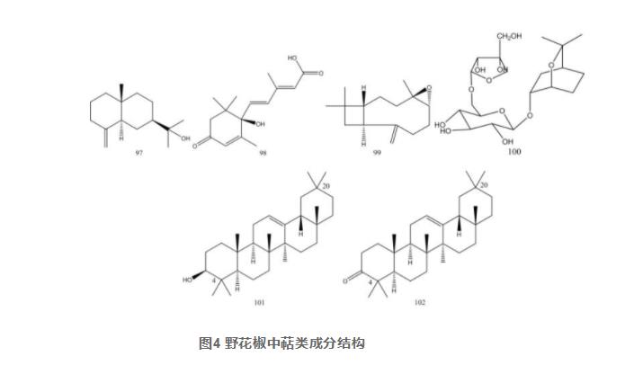 萜類(lèi)為一類(lèi)由甲戊二羥酸衍化而成,基本上碳架多具備兩個(gè)或兩個(gè)之上異戊二烯企業(yè)結(jié)構(gòu)類(lèi)型的化學(xué)物質(zhì),野花椒中消息了八個(gè)三萜類(lèi)(97~102),結(jié)構(gòu)特征有倍半萜類(lèi)和三萜類(lèi),倍半萜類(lèi)物質(zhì)的基本上碳架由15個(gè)氧原子(3個(gè)異戊二烯模塊)組成,包含單環(huán)倍半萜、雙孔倍半萜和三環(huán)倍半萜,三三萜類(lèi)的基本上碳架由30個(gè)氧原子(6個(gè)異戊二烯模塊)組成,均為齊墩果烷型五環(huán)三萜,即基本上碳架為多氫蒎的五環(huán)母核,母核上面有八個(gè)羥基,C4位和C20位都各有兩個(gè)羥基的五環(huán)三萜類(lèi)。見(jiàn)表3、圖4。