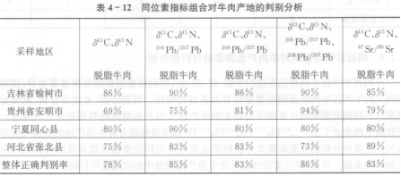 單一放射性核素指標(biāo)值對牛羊肉原產(chǎn)地的恰當(dāng)辨別率非常低,最大的僅為73%(表4-11),而將各類放射性核素指標(biāo)值融合開展間距判別分析,他們對牛羊肉原產(chǎn)地的恰當(dāng)辨別率明顯提升。脫油牛羊肉、牛尾毛中δ13C、δ15N二項指標(biāo)值融合,對牛羊肉原產(chǎn)地的總體恰當(dāng)辨別率各自提升到78%和85%;牛尾毛中的δ13C、δ15N和δD三項指標(biāo)值融合,總體恰當(dāng)辨別率進(jìn)一步提高,做到92%;脫油牛羊肉中碳、氮二項放射性核素指標(biāo)值與鉛、鍶放射性核素指標(biāo)值各自組成后,對牛羊肉原產(chǎn)地的總體恰當(dāng)辨別率也明顯增強(qiáng),但他們均小于碳、氮、氘三項指標(biāo)值對牛羊肉原產(chǎn)地的總體恰當(dāng)辨別率(表4-12)。