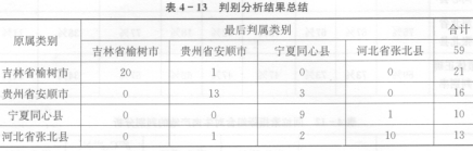 運用逐漸判別分析創(chuàng)建辨別實體模型時,常去除關(guān)聯(lián)性十分髙的自變量。因而,辨別實體模型中導(dǎo)入了脫油牛羊肉的δ13C、δ15N二項指標(biāo)值。在間距判別分析結(jié)果中,此三項指標(biāo)值對牛羊肉原產(chǎn)地的總體恰當(dāng)辨別率是92%(表4-12)。運用所確立的辨別實體模型對四個地區(qū)的樣品開展判別分析,59個樣品中有七個樣版被錯判,總體恰當(dāng)辨別率是88%(表4-13),辨別實際效果比較好。在具體運用中,運用此辨別實體模型可對盲樣開展辨別。辨別方式為將所檢驗的變量類型帶入以上辨別實體模型中,較為四個地區(qū)Y值尺寸,盲樣屬于Y值最高的地區(qū)。