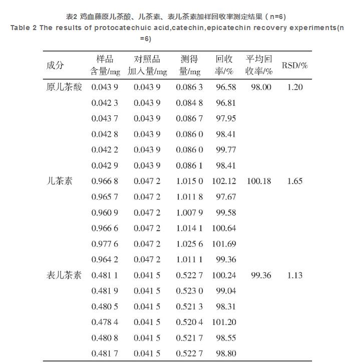 高精密汲取混和標準品水溶液,按“2.2.1”項下色譜儀標準反復氣相6次,結果原兒茶酸、兒茶酸、表兒茶素峰總面積的RSD各自為0.35%、0.45%、1.83%,說明儀器設備精度優(yōu)良。