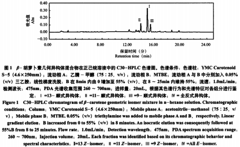因而,C18-HPLC-PDA已變成判定、定量分析檢驗β-胡羅卜素的常見方式??墒?,β-胡羅卜素幾何圖形同分異構(gòu)體的分離出來在C18柱上碰到較大艱難。C30柱的產(chǎn)生為β-胡羅卜素幾何圖形同分異構(gòu)體的分離出來保證了新的挑選。因為C30烷基的鏈長與胡羅卜素分子結(jié)構(gòu)的長短貼近,因此二者的相互影響獲得了提高。因此 ,C30柱在分離出來幾何圖形同分異構(gòu)體時展現(xiàn)出突出的優(yōu)點。此外,C30固定不動相比長的烷基鏈也增多了固定不動相的疏水性,造成 非極性胡羅卜素的保存期提升,進(jìn)而增強(qiáng)了柱效。圖1為惠伯棣等發(fā)布的β-胡羅卜素在C30-HPLC的分離出來色譜。