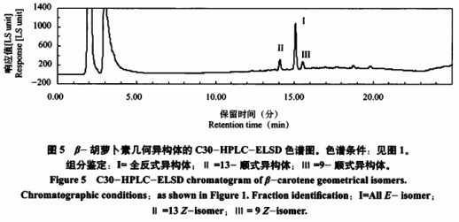 圖5為β-胡羅卜素幾何圖形同分異構(gòu)體的C30-HPLC-ELSD色譜。