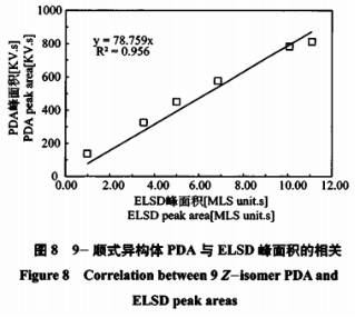 紀(jì)錄不一樣濃度值的13-順式同分異構(gòu)體、9-順式同分異構(gòu)體和全反式同分異構(gòu)體試品在PDA和ELSD上的峰總面積。二者之間表明出正線性相關(guān)(見圖7~圖9)。