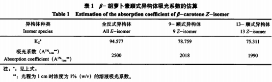 以全反式同分異構(gòu)體吸光度指數(shù)為標(biāo)準(zhǔn),依據(jù)上述公式計(jì)算,可估計(jì)出順式同分異構(gòu)體的吸光度指數(shù)(見表1)。