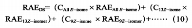 因為鹽藻源β-胡羅卜素成分帶有多種多樣幾何圖形同分異構(gòu)體,其視黃醇劑量可按式(10)測算。因為各順式同分異構(gòu)體的視黃醇劑量末見報導,鹽藻源β-胡羅卜素的視黃醇劑量現(xiàn)階段不明。
