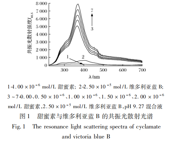 獨(dú)立的維秘藍(lán)B實(shí)際操作液的RLS數(shù)據(jù)信號(hào)較差,在400nm處有一較大透射峰,如曲線圖2所顯示。當(dāng)在維秘藍(lán)B實(shí)際操作液中添加Tris-HCl(pH9.27)水溶液后,RLS數(shù)據(jù)信號(hào)明顯提高,如曲線圖3所顯示。在曲線圖3水溶液的根基上添加0.00~2.00mL的甜蜜素規(guī)范實(shí)際操作液,從曲線圖3~7得知,光譜儀曲線圖在369nm處有一較大特點(diǎn)透射峰,此峰與獨(dú)立的維秘藍(lán)B相較為,紅移31nm。在管理體系溶液的特征峰處,一定濃度值標(biāo)準(zhǔn)的甜蜜素的濃度值(或摩爾質(zhì)量濃度值)與管理體系水溶液的共震光透射提高抗壓強(qiáng)度ΔIRLS呈線性相關(guān)。故挑選369nm做為測(cè)量光波長(zhǎng),用以甜蜜素的定性分析。