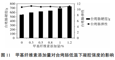 口味是點(diǎn)評肉食品品質(zhì)優(yōu)劣的主要因素,而延展性和強(qiáng)度是衡量一個(gè)商品口味優(yōu)劣的核心指標(biāo)值。一般將強(qiáng)度界定為第一次縮小試品需要的最高的力,其數(shù)值第一次壓擠全過程中的最高值,是最立即反映口味的一個(gè)指標(biāo)值;延展性界定為試品歷經(jīng)縮小后復(fù)原的高寬比與原來高寬比的比率,其標(biāo)值為b/a;如圖所示11所顯示,加上羧甲基纖維素后,制冷模式下檢測臺(tái)灣烤腸強(qiáng)度會(huì)伴隨著羧甲基纖維素加上量的上升而不斷地提升,可是總體增長幅度并不大,當(dāng)加入量為1.2%時(shí),臺(tái)灣烤腸強(qiáng)度為731.9g,比空缺組提高了34.89%;制冷情況倒臺(tái)烤香腸的延展性沒有顯著的轉(zhuǎn)變 ,轉(zhuǎn)變曲線圖較為輕緩,差異不明顯。