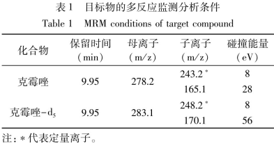 電子電離源(EI),水解動(dòng)能70eV,離子源溫度280℃,同軸電纜溫度300℃,多反映檢測(cè)(MRM)方式,條件見(jiàn)表1。