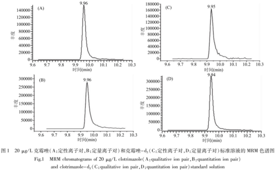 在EI水解源下,選用SCAN方式,對(duì)5.0mg/L的克霉嘩及克霉唑栓-d5各自開(kāi)展一級(jí)質(zhì)譜分析全掃描儀剖析,挑選進(jìn)化速率最大的做為母正離子。在不一樣撞擊動(dòng)能下,對(duì)目的物的母正離子各自開(kāi)展二級(jí)質(zhì)譜分析掃描儀,獲得每一個(gè)母正離子的殘片正離子,挑選進(jìn)化速率較高的3個(gè)子離子,配置不一樣品種的空缺試品栽培基質(zhì)標(biāo)液,在MRM方式下提升各種各樣質(zhì)譜分析標(biāo)準(zhǔn),去除易受殘?jiān)绊?,挑選半度最大的兩個(gè)子離子做為定量分析正離子和判定正離子,最終再對(duì)每對(duì)離子對(duì)的撞擊能做提升以達(dá)到最佳敏感度。標(biāo)液MRM色譜見(jiàn)圖1。