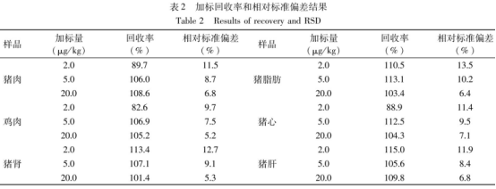在不一樣小動(dòng)物源食物的空缺試品中,各自開(kāi)展2.0、5.0、20.0μg/kg三個(gè)不一樣濃度值水準(zhǔn)的加標(biāo)回收試驗(yàn),每一個(gè)水準(zhǔn)反復(fù)測(cè)量6次,根據(jù)放射性核素內(nèi)標(biāo)法測(cè)算其利用率和相對(duì)標(biāo)準(zhǔn)偏差(RSD),結(jié)果見(jiàn)表2。選用了放射性核素內(nèi)標(biāo)定量分析技術(shù)性,校準(zhǔn)了總體目標(biāo)物的損害、提升了檢測(cè)效果的穩(wěn)定度和可重復(fù)性,測(cè)得克霉唑栓的利用率在82.6%~116.5%之問(wèn),相對(duì)性相對(duì)標(biāo)準(zhǔn)偏差為5.2%~13.5%,表明該辦法的準(zhǔn)確性和精度優(yōu)良。象征性的試品加標(biāo)色譜見(jiàn)圖2,在克霉唑栓出峰處沒(méi)有殘?jiān)绊?,表明本探討使用的凈化處理流程獲得了較好的實(shí)際效果。