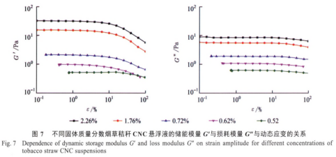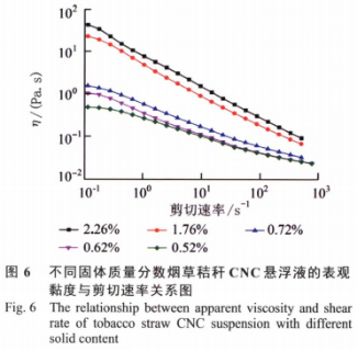 CNC混液剪切速率與粘度η的影響曲線圖如圖所示6所顯示,CNC混液的表觀粘度隨剪切速率擴(kuò)大而逐步減少,且含固量越高,η越高。在檢測(cè)標(biāo)準(zhǔn)內(nèi),CNC混液固態(tài)質(zhì)量濃度在做到1.76%時(shí),混液主要表現(xiàn)出突出的裁切變濃個(gè)人行為,在固態(tài)質(zhì)量濃度小于1.76%時(shí),在高剪切速率下混液主要表現(xiàn)出裁切變濃個(gè)人行為,這主要是因?yàn)榧魬?yīng)力使CNC網(wǎng)絡(luò)架構(gòu)產(chǎn)生破裂,造成 粘度降低,發(fā)生裁切變濃個(gè)人行為。