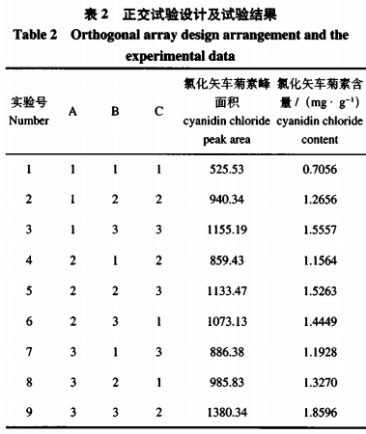 稱量黑果腺肋花楸提取液9份,每一份0.5g,放進(jìn)圓底燒瓶中,按正交試驗(yàn)表開展實(shí)驗(yàn),結(jié)果見表2。