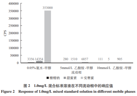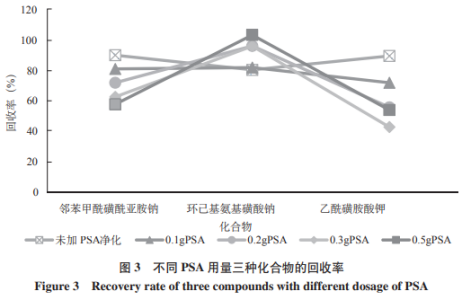 試品不經(jīng)過凈化處理解決,栽培基質(zhì)抑制效應(yīng)顯著,因而試驗(yàn)中調(diào)查用三氯乙酸水溶液(1g/L)、PSA分散化固相萃取、乙酸鋅-亞鐵氰化鉀凈化處理試品。三氯乙酸水溶液是有效的蛋白質(zhì)混凝劑,但三氯乙酸吸電子效應(yīng)顯著,不利三種總體目標(biāo)化學(xué)物質(zhì)脫氫水解。PSA固相吸收劑,與NH2類似的吸收劑,有兩個(gè)羥基,比羥基柱更強(qiáng)的離子交換法工作能力,弱陽離子互換(水溶栽培基質(zhì)),用以除去有機(jī)物、黑色素和金屬離子。用PSA分散化固相萃取能夠 有效的除去飲品中的除去有機(jī)物、黑色素和金屬離子,但它一起也會吸咐一部分糖精鈉和安賽蜜(見圖3),因此一般試品經(jīng)過濾系統(tǒng)后立即測量糖精鈉與安賽蜜成分,經(jīng)PSA分散化固相萃取后過慮測量甜蜜素成分,0.3~0.5gPSA使用量能夠 獲得不錯(cuò)的利用率。