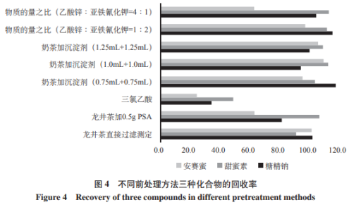 2Zn2 [Fe(CN)6]4 =Zn2[Fe(CN)6]↓(乳白色),乙酸鋅與亞鐵氰化鉀反映產(chǎn)生的氰亞鐵酸鋅沉積來挾走或吸咐影響化學(xué)物質(zhì),這類回應(yīng)劑除蛋白工作能力強(qiáng),但褪色能力較差。試驗(yàn)中調(diào)查混凝劑的使用量:各自用乙酸鋅-亞鐵氰化鉀0.5~0.5mL、0.75~0.75mL、1.0~1.0mL、2.0~2.0mL、1.0~2.0mL(質(zhì)量摩爾濃度比例1∶2)和2.0~1.0mL(質(zhì)量摩爾濃度比例4∶1)解決5.0g試品,試驗(yàn)說明僅有當(dāng)氰亞鐵酸鋅成分做到0.00075moL時(shí),且依照有機(jī)化學(xué)計(jì)量檢定反映占比添加混凝劑,三種化學(xué)物質(zhì)的利用率才不錯(cuò)(見圖4),但太多的溶液進(jìn)到UPLC/MS/MS系統(tǒng)軟件會在錐空上堆積,危害水解高效率,因此本試驗(yàn)采用混凝劑使用量為:乙酸鋅0.0002moL,亞鐵氰化鉀0.0001moL。對別的含乳試品能夠 參照本試驗(yàn)挑選適宜的混凝劑使用量。