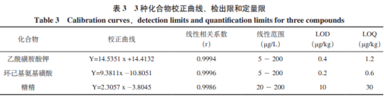 3種化學(xué)物質(zhì)工作中標(biāo)曲見表3,安賽蜜和甜蜜素在5~200μg/L范疇內(nèi),人造糖在20~200μg/L范疇內(nèi),線形相關(guān)系數(shù)r>0.995,20μg/L和200μg/L標(biāo)液持續(xù)氣相6次,精度為8.6%和5.4%,方法檢出限(S/N=3)為0.2~10μg/kg,方式定量限(S/N=10)為0.6~30μg/kg,見表3。