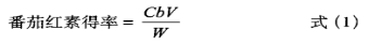將聚集液稀釋液后,在較大光波長(zhǎng)處測(cè)OD值值,帶入線性方程,測(cè)算出番茄素在核桃油中的濃度值,依據(jù)下式測(cè)算出番茄素的提取率(μg值)。