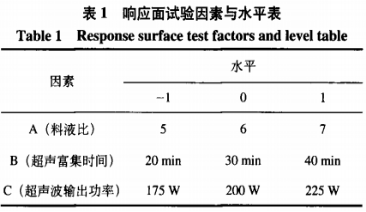 在單要素的根基上,以番茄素得率為調(diào)查指標(biāo)值,選擇料液比(A)、超聲波聚集時(shí)間(B)、超音波功率(c)三個(gè)要素根據(jù)手機(jī)軟件DesignExpertV8.0.6中的Box-Benhnken實(shí)驗(yàn)原理,設(shè)計(jì)方案三要素三水準(zhǔn)實(shí)驗(yàn),見(jiàn)表1。