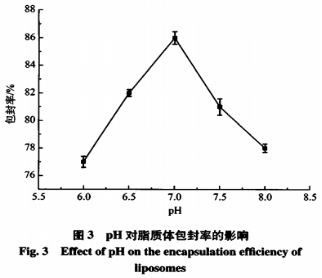 pH對(duì)脂質(zhì)體的包裹率如圖所示3所顯示,pH為7.0時(shí),脂質(zhì)體包裹率做到最高值,再次升高pH,脂質(zhì)體包裹率降低。這是由于pH危害脂質(zhì)體表層正電荷,正電荷的更改會(huì)危害脂質(zhì)體的構(gòu)造可靠性。脂質(zhì)體雙分子結(jié)構(gòu)層顯得松散,直徑增大,使所述藥品水溶液滲入出去,進(jìn)而危害芯板的包埋。