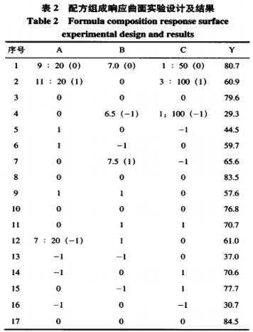 對(duì)實(shí)驗(yàn)統(tǒng)計(jì)數(shù)據(jù)開(kāi)展線性擬合,獲得包裹率(Y)對(duì)碳水化合物:大豆卵磷脂(W:W)(A),緩沖液pH(B)番茄素:大豆卵磷脂(W:W)(C)的二次多元線性回歸方程式為