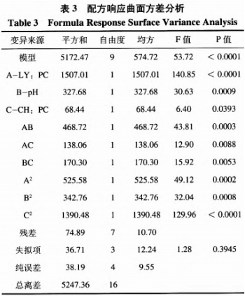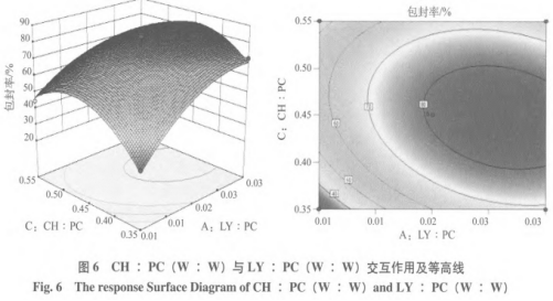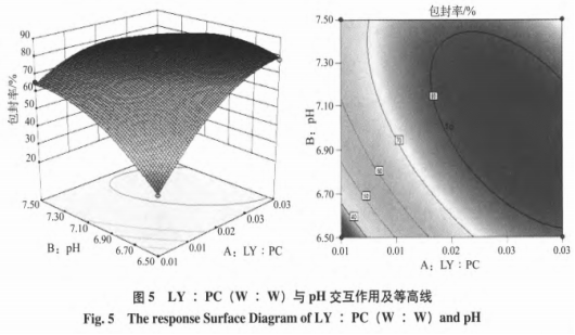 LY:PC(W:W)和緩沖液pH,CH:PC(W:W)和LY:PC(W:W),CH:PC(W:W)和緩沖液pH對(duì)包裹率的3d圖紙均呈雙曲線狀,等高線圖呈扁圓形。即LY:PC(W:W)和緩沖液pH,CH:PC(W:W)和LY:PC(W:W),CH:PC(W:W)和緩沖液pH的配對(duì)t檢驗(yàn)對(duì)包裹率都是有明顯危害。LY:PC(W:W)和緩沖液pH配對(duì)t檢驗(yàn)的3d圖紙較陡,且等值線聚集。表明LY:PC(W:W)和緩沖液pH配對(duì)t檢驗(yàn)對(duì)包裹率的危害更明顯,即LY:PC(W:W)和pH對(duì)包裹率危害更顯著。