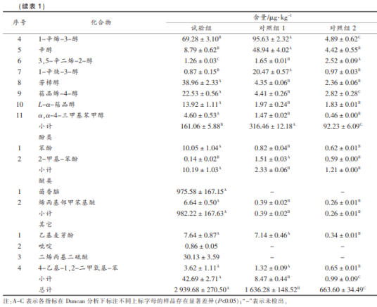 表明對(duì)照實(shí)驗(yàn)1和對(duì)照實(shí)驗(yàn)2的整體味道比較類似。為進(jìn)一步研究3種咸肉味道成份的區(qū)別,選用頂空進(jìn)樣器固相微提純-氣質(zhì)聯(lián)用儀技術(shù)性對(duì)3種咸肉中的揮發(fā)成份開(kāi)展評(píng)定。