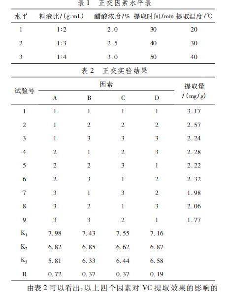 根據(jù)對(duì)料液比、冰醋酸濃度值、獲取時(shí)間、獲取溫度等單要素對(duì)VC獲取實(shí)際效果的剖析,開(kāi)展正交試驗(yàn)。為了更好地明確最好獲取實(shí)際效果,以萃取液在λmax=243nm處OD值為評(píng)定指標(biāo)值,對(duì)之上四個(gè)要素設(shè)計(jì)方案L9(34)正交試驗(yàn),要素水準(zhǔn)表見(jiàn)表1,正交試驗(yàn)結(jié)果見(jiàn)表2。