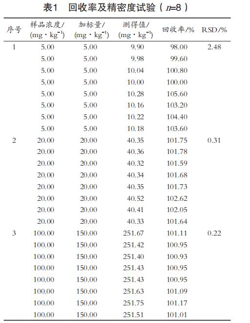 各自在5.0,20和100mg/kg的試樣中添加5.0,20和150mg/kg維他命C標(biāo)液開(kāi)展利用率實(shí)驗(yàn),每一份試品反復(fù)測(cè)量8次;結(jié)果見(jiàn)表1,從結(jié)果得知,其利用率在98.00%~105.60%中間,相對(duì)偏差為0.22%~2.48%。