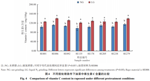 前一種處理方法下八個(gè)油菜子試品中維他命C成分的平均數(shù)為115.71mg/100g,后面一種其均值為99.96mg/100g(圖4)。運(yùn)用液態(tài)氮碾磨過后的油菜子試品所測(cè)量的維他命C成分明顯高過未碾磨加工處理的試品。所選定的8種油菜子試品碾磨以后較未碾磨時(shí)的維他命C成分各自提高了16%、15%、14%、16%、17%、11%、20%、18%,測(cè)得維他命C的成分均值提升了約16%。表明運(yùn)用液態(tài)氮將試樣碾磨成粉狀后,再用均質(zhì)機(jī)開展勻漿解決,更為有益于油菜子試品中維他命C的徹底獲取。
