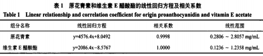 高精密稱量105℃干躁至恒重的花青素標(biāo)準(zhǔn)品28.63mg和維生素E冰醋酸酯標(biāo)準(zhǔn)品12.42mg于同一個(gè)10mL容量瓶中,加適當(dāng)工業(yè)甲醇融解并稀釋液至標(biāo)尺,混勻,獲得混和標(biāo)準(zhǔn)品儲(chǔ)備液。該儲(chǔ)備液遮光儲(chǔ)存?;旌鸵?guī)范儲(chǔ)備液適當(dāng),逐步稀釋液,配置成花青素濃度值為0.2806、0.8417、1.4028、1.9640、2.8057mg/mL,維生素E冰醋酸酯濃度值為0.1236、0.3707、0.6179、0.8651、1.2358mg/mL的混和標(biāo)液,以十八烷基氯硅烷引線鍵合硅橡膠為填充料,DikmaDiamons訂C18(4.6mm×150mm,5μm);流動(dòng)性相:工業(yè)甲醇;流動(dòng)速度:1.0mL/min;檢驗(yàn)光波長:284nm柱溫:30℃;進(jìn)樣量:10μL。的色譜儀標(biāo)準(zhǔn)氣相剖析,紀(jì)錄色譜。以峰總面積積分?jǐn)?shù)值縱軸,標(biāo)準(zhǔn)品濃度值為橫坐標(biāo)軸,開展回歸分析,花青素在0.2806~2.8057mg/mL濃度值范疇內(nèi),維生素E冰醋酸酯在0.1236~1.2358mg/L濃度值范疇內(nèi)呈優(yōu)良的線性相關(guān)。二者的線形相關(guān)系數(shù)r均為0.999之上,兩成分線形線性回歸方程、相關(guān)系數(shù)r如表1所顯示。