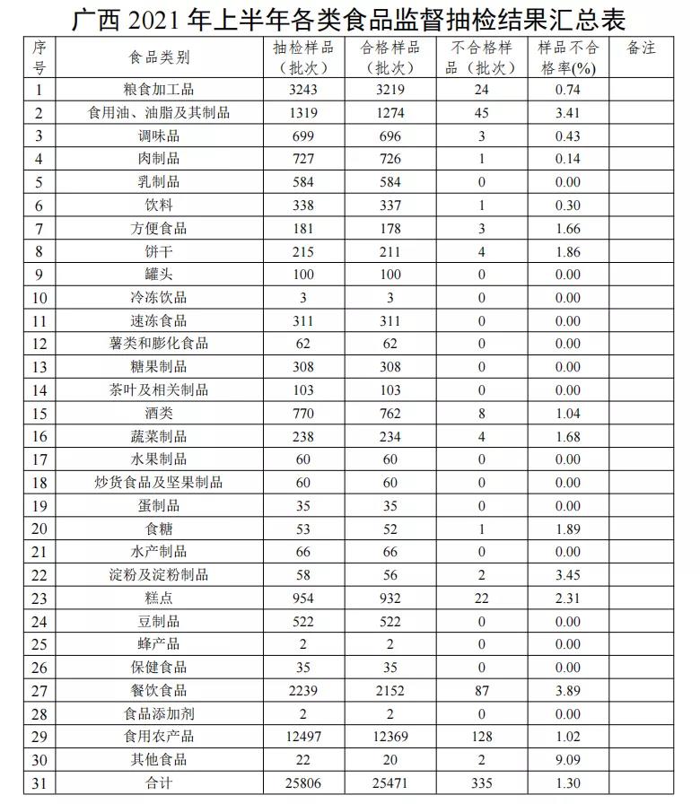 依據(jù)廣西自治區(qū)銷售市場(chǎng)監(jiān)督管理局食品衛(wèi)生安全監(jiān)管抽樣檢驗(yàn)工作部署和方案分配,2021年上半年度我區(qū)共進(jìn)行抽樣檢驗(yàn)并發(fā)布25806批號(hào)食品類試品,達(dá)標(biāo)試品25471批號(hào),不過(guò)關(guān)試品335批號(hào),整體不過(guò)關(guān)試品診斷率為1.30%,與2020年同比增加降低了0.45個(gè)點(diǎn)。下邊,就要大家一起來(lái)看看哪種食品質(zhì)量安全最扎實(shí)吧: