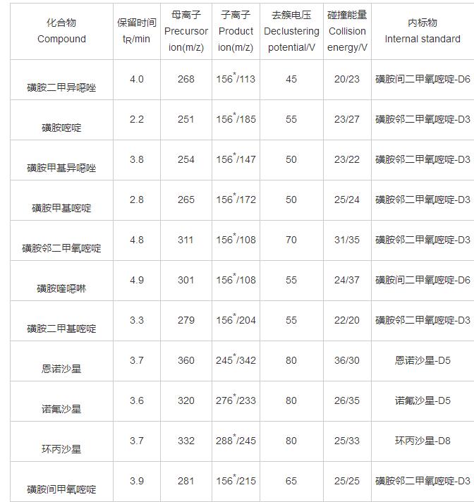 磺胺二甲異噁唑、磺胺嘧啶、磺胺羥基異噁唑、磺胺噻唑、磺胺羥基嘧啶、磺胺鄰二甲氧嘧啶、磺胺二甲基嘧啶、磺胺喹噁林、磺胺間甲氧嘧啶、磺胺間二甲氧嘧啶、磺胺氯噠嗪、磺胺甲噻二唑、恩諾沙星、環(huán)丙沙星、環(huán)丙沙星、達(dá)氟沙星、氟羅沙星、培氟沙星、洛美沙星、氧氟沙星、金剛烷胺、金剛乙胺、金剛烷胺-D15(10mg/L),恩諾沙星-D5、環(huán)丙沙星-D5、環(huán)丙沙星-D8、磺胺鄰二甲氧嘧啶-D3、磺胺間二甲氧嘧啶-D6、氯霉素-D5水溶液國家標(biāo)準(zhǔn)物質(zhì)(5mg/L),氯霉素、甲砜霉素、氟甲砜霉素水溶液國家標(biāo)準(zhǔn)物質(zhì)(100mg/L):均購于農(nóng)業(yè)農(nóng)村部農(nóng)業(yè)產(chǎn)品產(chǎn)品質(zhì)量標(biāo)準(zhǔn)研究所;工業(yè)甲醇、乙腈:色譜純,法國Merck企業(yè)商品;苯甲酸:色譜純,英國Sigma企業(yè)商品;無水硫酸鈉、乙酸銨、氧化鈉、正己烷、環(huán)己烷、硫酸(優(yōu)級純)、氫氧化鈉(分析純,成分25%~28%)、磷酸氫二鉀(分析純):上海市國藥控股商品;PSA、C18填充料(50μm):我國迪馬科技有限公司商品;二甲亞砜:分析純,天津市風(fēng)船化學(xué)藥品高新科技有限責(zé)任公司商品;試驗(yàn)自來水:自做超純水系統(tǒng)。