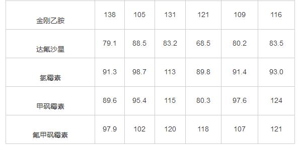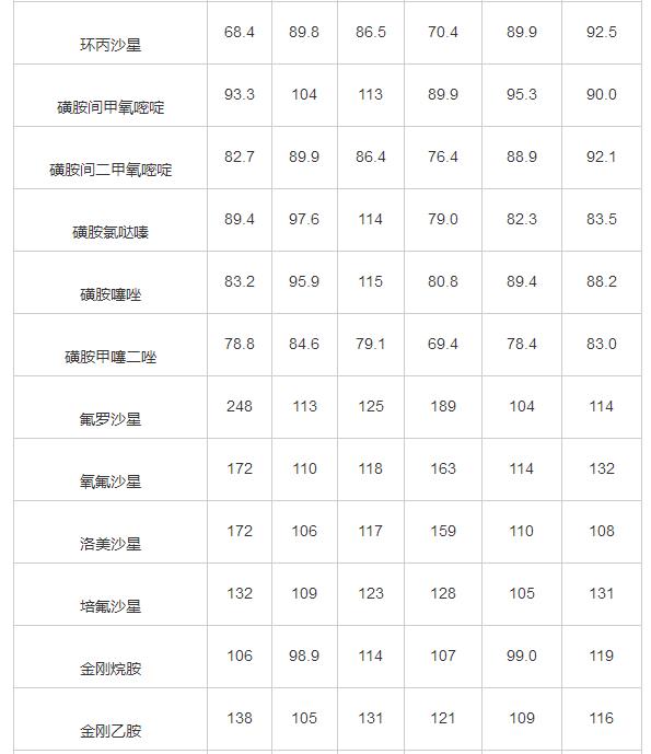 萃取液濃縮至干后,殘余物中有很多油狀物質(zhì),因而在于萃取液中添加8~10mL正己烷除脂后測量。結(jié)果顯示,大部分藥品的利用率高過除脂前,且敏感度提高,但磺胺間甲氧嘧啶、磺胺喹噁啉、洛美沙星和培氟沙星的利用率較弱。若應(yīng)用8~10mL環(huán)己烷-正己烷水溶液,則磺胺間甲氧嘧啶和磺胺喹噁啉的利用率在70%~120%以內(nèi),其他藥品的利用率也很好。因而,挑選8~10mL環(huán)己烷-正己烷水溶液除去萃取液中的人體脂肪。