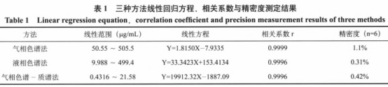 各自以峰總面積為縱軸,濃度值為橫坐標(biāo)軸,得線形線性回歸方程和相關(guān)系數(shù)r,測(cè)量結(jié)果如表1所顯示。結(jié)果顯示,三種辦法的相關(guān)系數(shù)r均做到>0.999,且精度RSD均<2%,說(shuō)明線形和精度優(yōu)良。