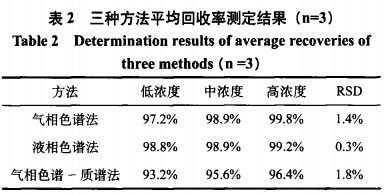 取己知成分的某原漿、油類0.5g各9份,依據(jù)曲線圖范疇,按低、中、濃度較高的各自高精密添加分別的標(biāo)準(zhǔn)品貯備液(GC添加1、3、5mL,HPLC添加1、2、3mL,GC-MS添加0.1、0.3、0.5mL),每一個(gè)濃度值3份,按分別的水溶液制取方式制取利用率水溶液,三種辦法的利用率測(cè)量結(jié)果如表2所顯示。結(jié)果顯示,三種辦法的利用率均在90%~100%中間,方式的精確性優(yōu)良。