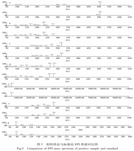 選用本方式對50批號消除疲勞類和提高睡眠質量類保健產品開展檢驗,外標法定量分析。試驗數據顯示,驗出呈陽性試品共8批號,定量分析結果見表5。每批號呈陽性試品最少與此同時驗出二種違規(guī)加上藥品,在其中驗出數最多的化學物質是硝西泮和炯酸,各驗出5批號,次之是他達那非,共驗出3批號,氯硝西泮、文法拉辛、硫代艾地那非各驗出2批號,氯苯那敏驗出1批號。全部呈陽性試品EPI譜圖均歷經EPI數據庫查詢(2.3)核對確診,以Fit、RevFit和Purity三個主要參數表明查找結果,其標值反映與總體目標化學物質的搭配水平。在其中FiL(F)意味著正符合率,即標準物質譜峰與試品譜峰的相似性,最高值為100,值越大表明是該化學物質的概率越大;RevFit(R)意味著反符合率,即試品譜圖與標準物質譜圖的相似性;Purity(P)意味著純凈度,是綜合性前二種結果得到的標值,即試品譜圖與數據表中的標準物質譜圖之問在質量數、進化速率等主要參數層面的相似性。EPI數據庫查詢搜庫結果中總體目標化學物質依照P值從大到小的排列順序;一部分呈陽性試品質譜分析對比分析見圖3。