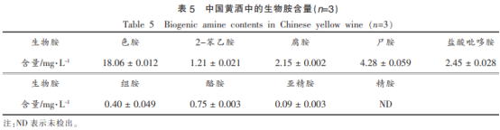 用所確立的辦法剖析米酒與純糧酒中微生物胺成分,結(jié)果見(jiàn)表5和表6。由表5得知,米酒中帶有8種微生物胺,總成分為29.39mg/L,各微生物胺成分均有差別。色胺與尸胺為該米酒試品中的關(guān)鍵微生物胺,成分各自為(18.06±0.012)mg/L與(4.28±0.059)mg/L,β-苯乙胺成分為(1.21±0.021)mg/L,腐胺成分為(2.15±0.002)mg/L,硫酸吡哆胺成分為(2.45±0.028)mg/L,組織胺成分為(0.40±0.049)mg/L,酪胺成分為(0.75±0.003)mg/L,亞精胺成分為(0.09±0.003)mg/L,精胺未驗(yàn)出。純糧酒檢驗(yàn)結(jié)果見(jiàn)表6。純糧酒中微生物胺總成分在3.83~7.94mg/L中間,在其中組織胺在4種純糧酒中被驗(yàn)出,精胺只在一種純糧酒中驗(yàn)出,其他7種微生物胺在5種純糧酒中都被驗(yàn)出。較為米酒與純糧酒中各微生物胺成分能夠 發(fā)覺(jué),米酒中的微生物胺總成分高過(guò)純糧酒。這與以前科學(xué)研究報(bào)導(dǎo)一致。盡管二者均選用釀制加工工藝,可是中后期加工工藝不一樣,米酒不用水蒸氣蒸餾解決,而純糧酒需水蒸氣蒸餾解決,水蒸氣蒸餾后酒質(zhì)中微生物胺成分大大減少。此外,催化反應(yīng)碳水化合物脫羧反應(yīng)轉(zhuǎn)化成微生物胺的脫羧酶,在pH4.04~4.33的米酒釀制環(huán)節(jié)中被誘發(fā)生成,造成 米酒中微生物胺成分相比較多。