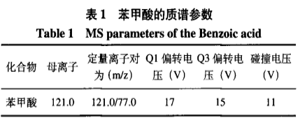 ESI(一);正離子噴霧器工作電壓:4.5kV;做霧化氣:N23.0L/min;干躁氣:N215L/min;撞擊氣:氬氣;DL溫度:250℃;加熱器溫度:400℃;逐行掃描:多反映檢測(cè)(MRM);停留時(shí)間:20ms;時(shí)間延遲:3ms;MRM主要參數(shù):見(jiàn)表1。
