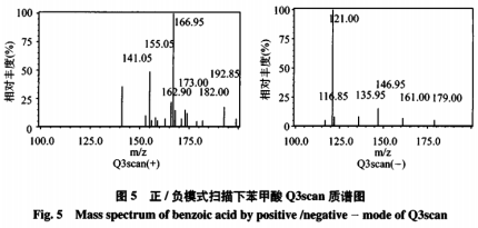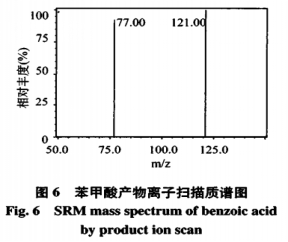 配置苯甲醛濃度值為1mg/L,在Q3scan逐行掃描下,與此同時(shí)開(kāi)展共價(jià)鍵方式和空氣負(fù)離子方式收集,實(shí)驗(yàn)結(jié)果顯示:空氣負(fù)離子方式得到極強(qiáng)的準(zhǔn)分子離子數(shù)據(jù)信號(hào),影響相對(duì)性較少。這與苯甲醛分子式相關(guān),苯甲醛有羧基構(gòu)造,易水解轉(zhuǎn)化成羧基,進(jìn)而在負(fù)方式下更非常容易獲得極強(qiáng)的準(zhǔn)分子離子,因而試驗(yàn)室挑選了空氣負(fù)離子方式。根據(jù)立即氣相標(biāo)液,質(zhì)譜分析全自動(dòng)提升獲得苯甲醛:定量分析離子對(duì)為121.0/77.0。