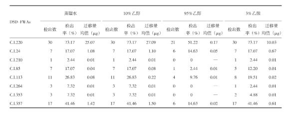 純凈水、3%甲酸、10%酒精和95%酒精4種食品類模仿物中驗(yàn)出C.I.220、C.I.24、C.I.210、C.I.85、C.I.113、C.I.264、C.I.353和C.I.357。在同樣轉(zhuǎn)移溫度和時(shí)間下,不一樣類型食品類模仿物中8種DSD-FWAs轉(zhuǎn)移量不一樣,轉(zhuǎn)移量從大到小先后為10%酒精、純凈水、3%甲酸和95%酒精。C.I.220、C.I.85、C.I.113和C.I.357在3%甲酸中的轉(zhuǎn)移量低于純凈水和10%酒精的1/2。4種食品類模仿物中C.I.220的診斷率和轉(zhuǎn)移量均最大。C.I.220在10%酒精和純凈水中的轉(zhuǎn)移量是95%酒精中的500~2 000倍。見(jiàn)表1。