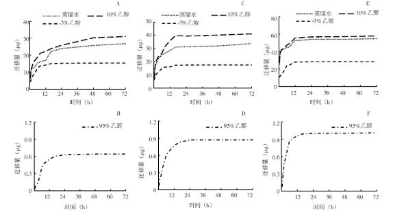 遮光情況下,各自取1.0 m L轉(zhuǎn)移實(shí)驗(yàn)后的4種食品類模仿物試品于離心管架內(nèi),與此同時(shí)將3%甲酸試品用12.5 mol/L Na OH水溶液調(diào)節(jié)p H值至8.0,26 400×g離心式5 min。純凈水、調(diào)節(jié)p H后的3%甲酸、10%酒精試品立即取上清液氣相,95%酒精試品自來(lái)水稀釋液2.5倍后再用HPLC-FLD法檢驗(yàn),與此同時(shí)配置相匹配的規(guī)范工作中曲線圖,保存期判定,外標(biāo)法峰總面積定量分析。選用Excel 2007手機(jī)軟件創(chuàng)建數(shù)據(jù)庫(kù)和制作轉(zhuǎn)移量發(fā)展趨勢(shì)曲線圖。