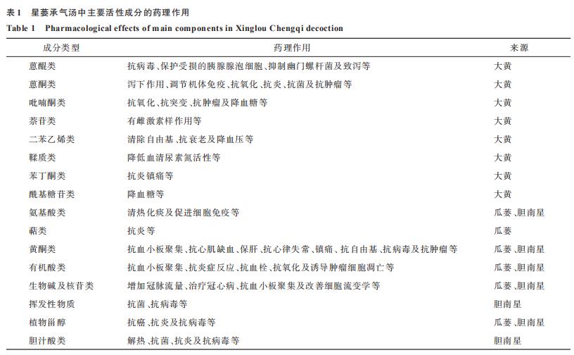 星蔞承氣湯中成分繁雜多種多樣,具備好幾個藥力成份群,即同一結構特征化學物質的藥用價值具備相似度,不一樣結構特征化學物質的藥用價值具備差異,按藥力成份群另一方中各中藥藥理功效開展梳理與匯總,見表1。