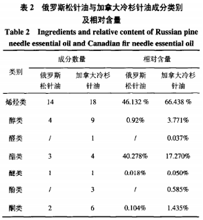 根據(jù)質(zhì)譜分析庫(kù)查找和人力圖普分析,融合保存指數(shù)值核對(duì),烏克蘭松樹(shù)皮油中評(píng)定出31種化學(xué)物質(zhì),占揮發(fā)物成份93.498%,在其中環(huán)己醇類(lèi)14個(gè),代烴4個(gè),脂質(zhì)3個(gè),醚類(lèi)一個(gè),大環(huán)內(nèi)酯兩個(gè),別的化學(xué)物質(zhì)七個(gè),主要成分為甲酸龍腦酯(40.158%),β-4-蒈烯(20.136%),檸檬烯(12.109%),Β-蒎烯(5.658%),龍腦(3.864%),萜品油烯(2.594%),β-石竹烯(2.303%),間傘花烴(1.578%),月桂烯(1.212%),α-蛇麻烯(1.037%)等化學(xué)物質(zhì);澳大利亞紅皮云杉針油中國(guó)共產(chǎn)黨評(píng)定出47種化學(xué)物質(zhì),占揮發(fā)物成份的92.449%,在其中環(huán)己醇類(lèi)1八個(gè),醛類(lèi)9個(gè),代烴一個(gè),脂類(lèi)4個(gè),醚類(lèi)一個(gè),酚類(lèi)化合物3個(gè),大環(huán)內(nèi)酯6個(gè),別的化學(xué)物質(zhì)五個(gè),主要成分為β-蒎烯(32.308%),甲酸龍腦酯(17.007%),δ-4-蒈烯(16.663%),檸檬烯(9.71l%),β-水芹烯(2.955%),月桂烯(1.807%),α-松油醇(1.666%)等化學(xué)物質(zhì),在其中烏克蘭松樹(shù)皮油、澳大利亞紅皮云杉針油中純天然環(huán)己醇類(lèi)物質(zhì)成分極為豐富多彩,各自占揮發(fā)物成份的46.132%、66.438%。由表2由此可見(jiàn),烏克蘭松樹(shù)皮油、澳大利亞紅皮云杉針油中化學(xué)物質(zhì)類(lèi)型及相對(duì)性成分間存有差別。