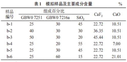 用瑩石國(guó)家標(biāo)準(zhǔn)物質(zhì)和石灰石國(guó)家標(biāo)準(zhǔn)物質(zhì)按一定占比配置6組高成分碳酸氫鈣基材含氟化鈣的仿真模擬試品,輔材為光譜儀純的SiO2,粒度分布均在75μm(200目)下列,氟化鈣成分操縱在10%~60%中間,序號(hào)分別為b–1,b–2,b–3,b–4,b–5,b–6,見表1。