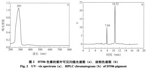 堿化的乙酸丁酯提取液經(jīng)蒸餾、工業(yè)甲醇復(fù)溶獲得高純黑色素水溶液,呈淡黃色(圖1)。DT06黑色素能溶解于水,有別于A.cristatus產(chǎn)的黃色素。黑色素甲醇溶液的紫外線由此可見掃描儀光譜儀如圖所示2a所顯示,在285nm上有特點(diǎn)消化吸收峰,與P.citreonigrum和E.rubrum黃色素各自在330nm和396nm處的特點(diǎn)消化吸收峰不一樣,285nm能夠 做為檢驗(yàn)光波長用以高效液相色譜色譜和黑色素成分測量。